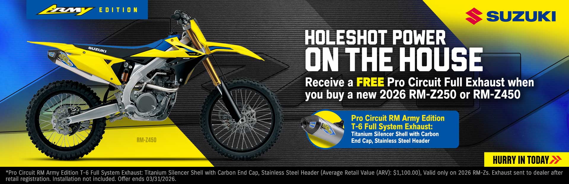 *Conditions apply. This offer is valid for $250 factory customer cash off a new, unregistered 2023-2026 Suzuki motorcycle, scooter, or ATV model. Discount is taken off of listed price and is contingent on model availability. Offer must be validated by participating authorized dealer at time of purchase. May be combined with other current retail incentives so long as all conditions are met. No substitutions. Offer applicable to active and retired first responders in law enforcement, fire and rescue services, or emergency medical services (First Responder) or an active or retired member of the United States Armed Forces (Military). Military and first responders may be required to provide verification of status. See dealer for eligibility. Not redeemable for cash. Offers void where prohibited. Only valid in the continental United States, excluding HI. See your local Suzuki dealer for complete details. All offers on 2023 models expire 03/13/2026. Offer valid between 01/01/2026 and 03/31/2026.
